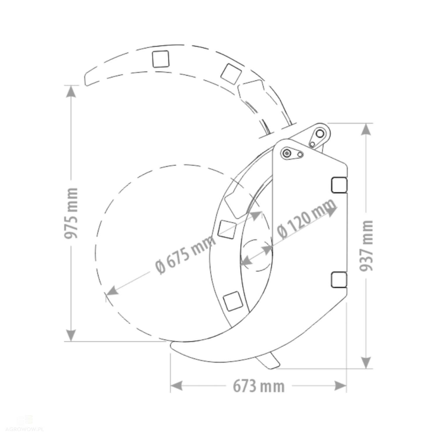 - Kompaktowe wymiary chwytaka do wyrywania drzewa – szerokość 685 mm, długość 673 mm, wysokość 937 mm (975 mm z zębem) – sprawiają, że sprzęt jest wyjątkowo poręczny i nadaje się do pracy na ograniczonej przestrzeni.
