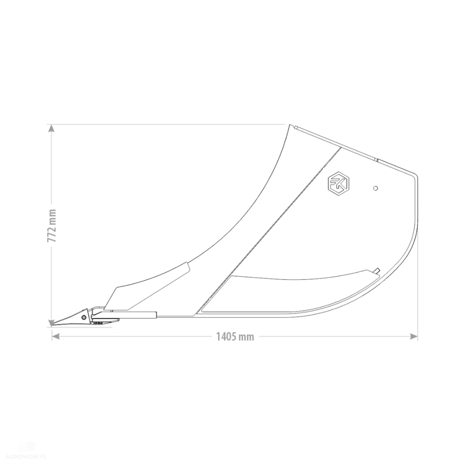 - Za wyjątkową trwałość narzędzia odpowiada zastosowanie wytrzymałych materiałów konstrukcyjnych: płaszcza ze stali S355 J2 o grubości 10 mm, boków o grubości od 8 do 10 mm, krawędzi natarcia z blachy HB400 (15+6 mm), lemiesza ze stali HB500 o wymiarach 250x25 mm oraz centralnego żebra o grubości 12 mm z tej samej stali konstrukcyjnej.