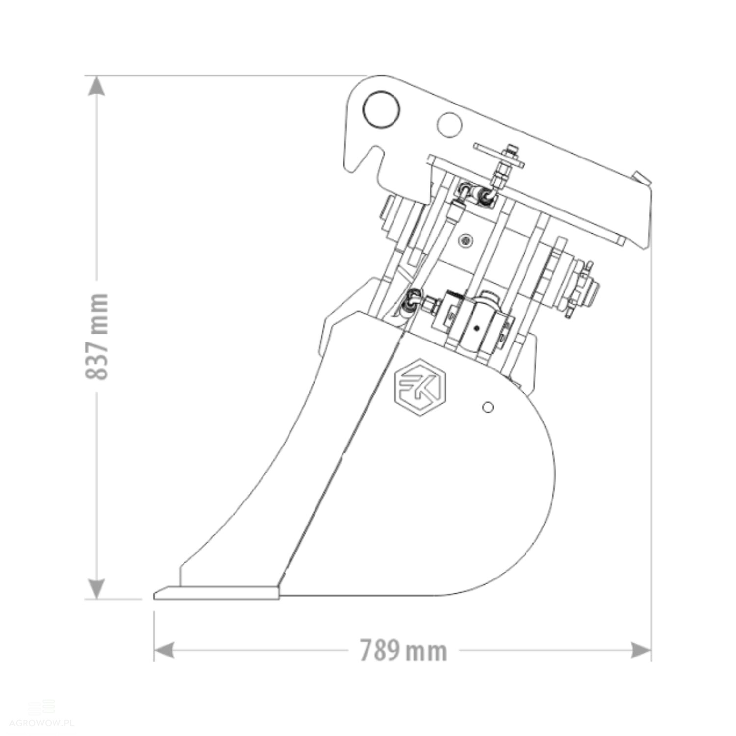 - Krawędź natarcia wzmocniona stalą HB400 o grubości 12 mm oraz lemiesz wykonany ze stali HB500 o wymiarach 200x20 mm zapewniają wysoką odporność na ścieranie i uszkodzenia mechaniczne, zwłaszcza przy pracy z twardymi materiałami.