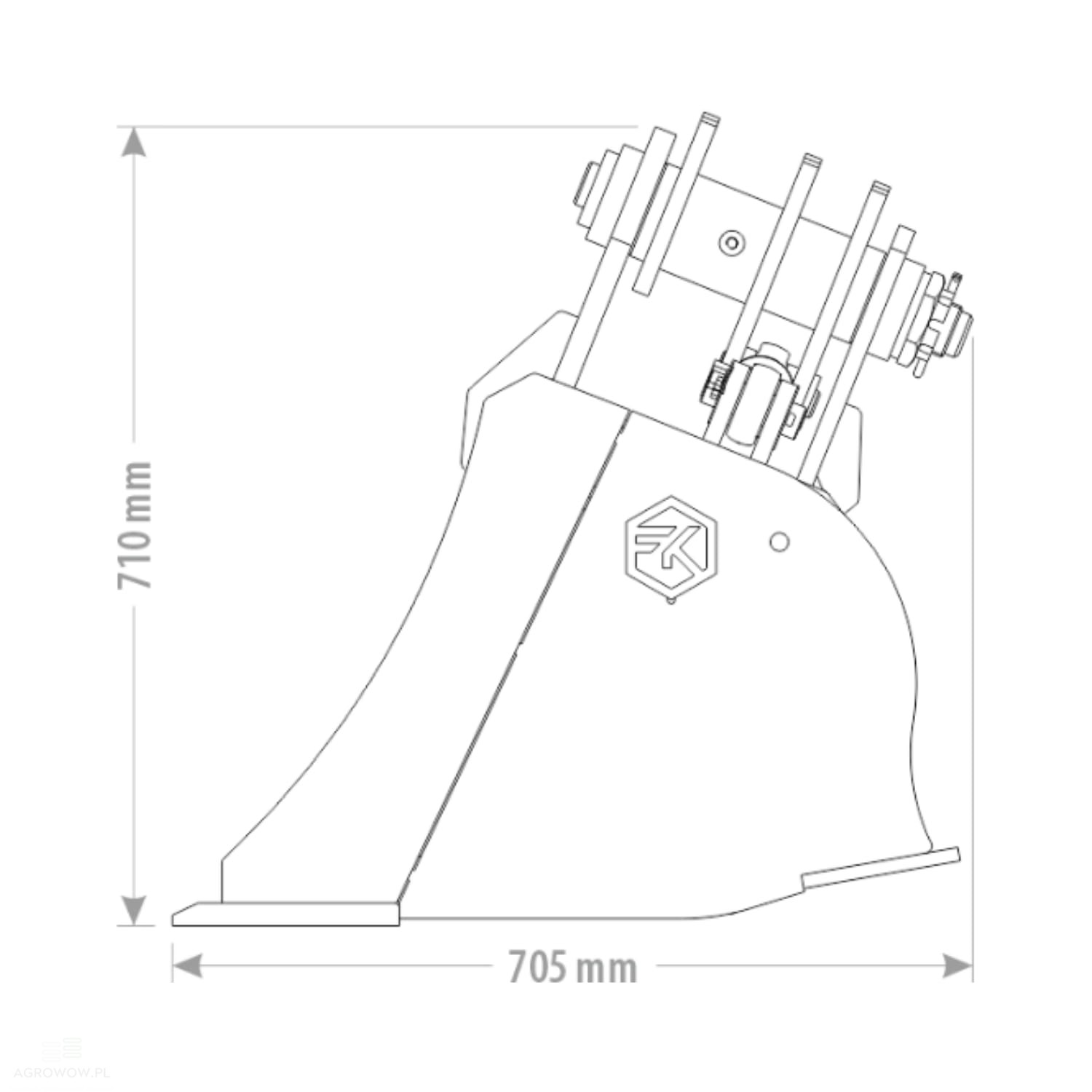 - Krawędź natarcia wzmocniona stalą HB400 o grubości 12 mm oraz lemiesz wykonany ze stali HB500 o wymiarach 200x20 mm i stalą HB400 o wymiarach 140x12 mm zapewniają doskonałą odporność na ścieranie i uszkodzenia mechaniczne, szczególnie przy pracy z twardymi materiałami.