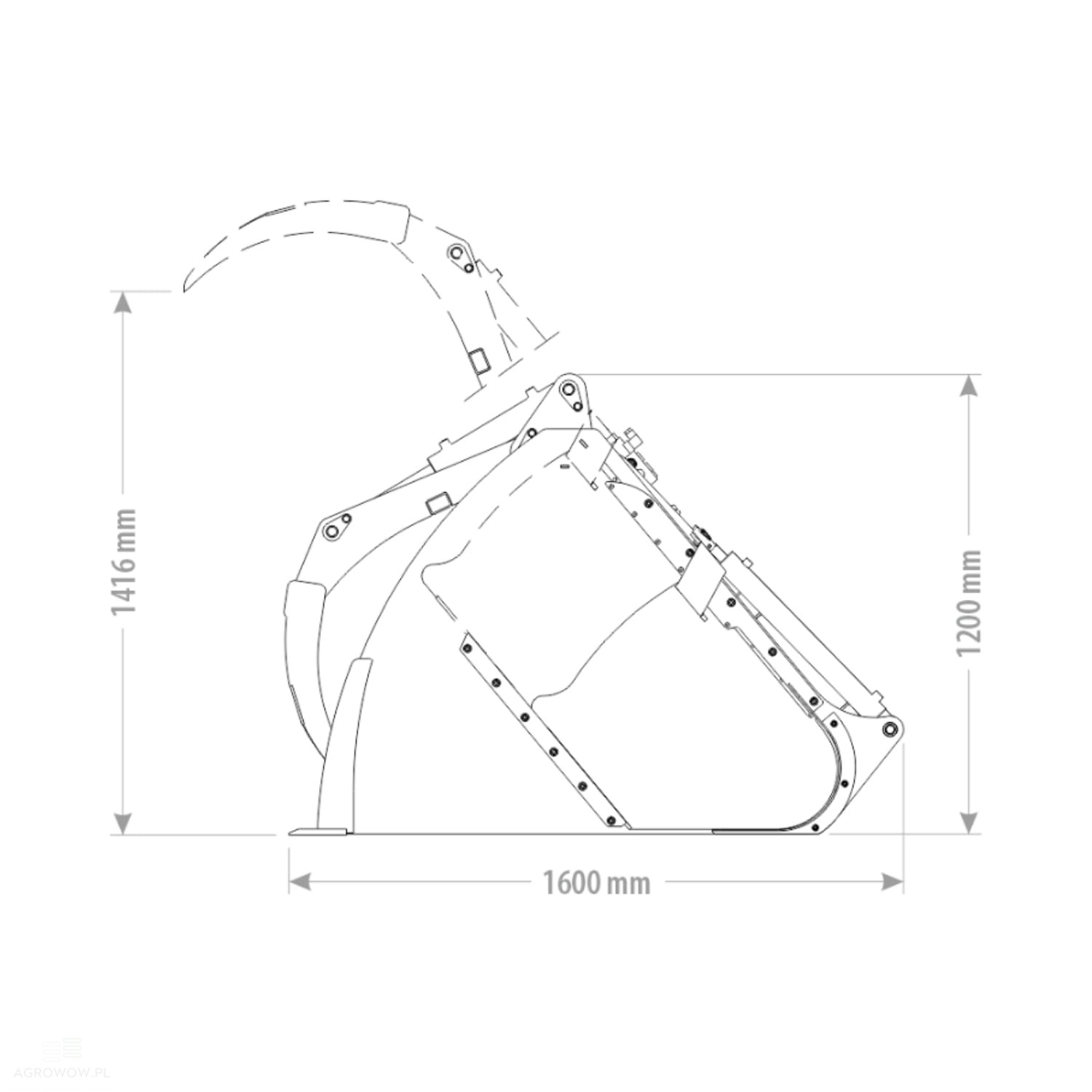 - Przy pojemności roboczej 2 m³ i wymiarach 1600 mm długości, 1200 mm wysokości (1416 mm z dociskiem), szufla umożliwia jednorazowy załadunek dużej ilości materiału, co znacząco usprawnia proces żywienia zwierząt i ogranicza liczbę przejazdów, oszczędzając czas i paliwo.