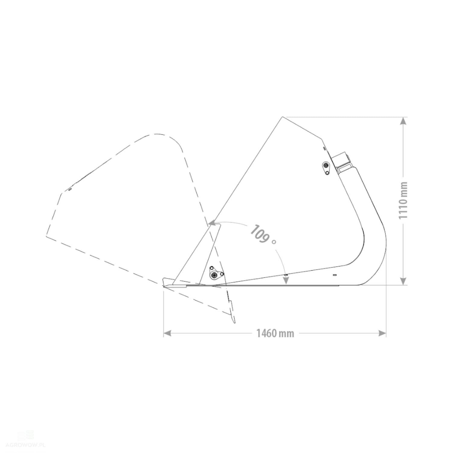 - O wymiarach: szerokość 1400 mm, długość 1460 mm i wysokość 1110 mm, szufla oferuje pojemność 0,96 m³, co czyni ją idealnym rozwiązaniem do większych zadań transportowych.