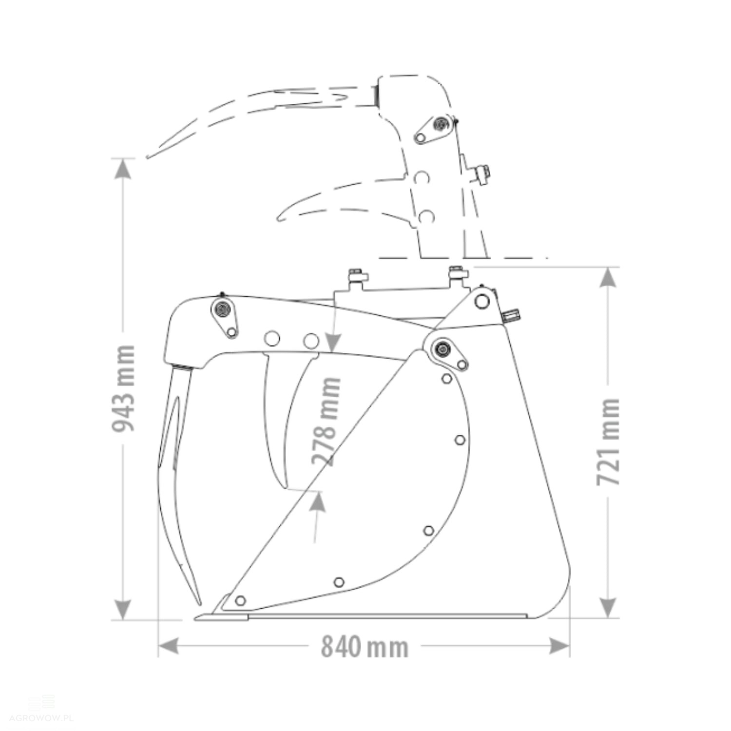 - Urządzenie wyposażone w 7 zębów docisku o długości 585 mm, wykonanych z kutego materiału, skutecznie zatrzymuje materiały w szufli, co poprawia efektywność transportu i przeładunku.