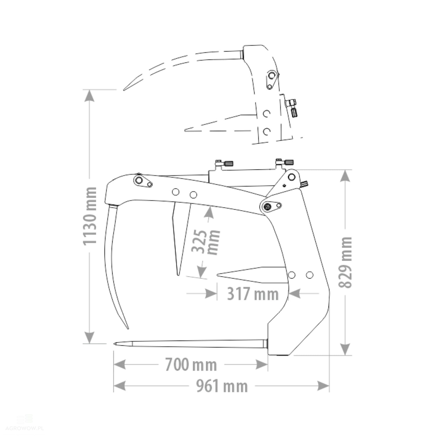 - Urządzenie wyposażone jest w 7/8 zębów docisku o długości 700 mm, wykonanych z kutego materiału, co zapewnia ich wyjątkową wytrzymałość oraz skuteczne zatrzymywanie materiałów, poprawiając efektywność transportu i przeładunku.