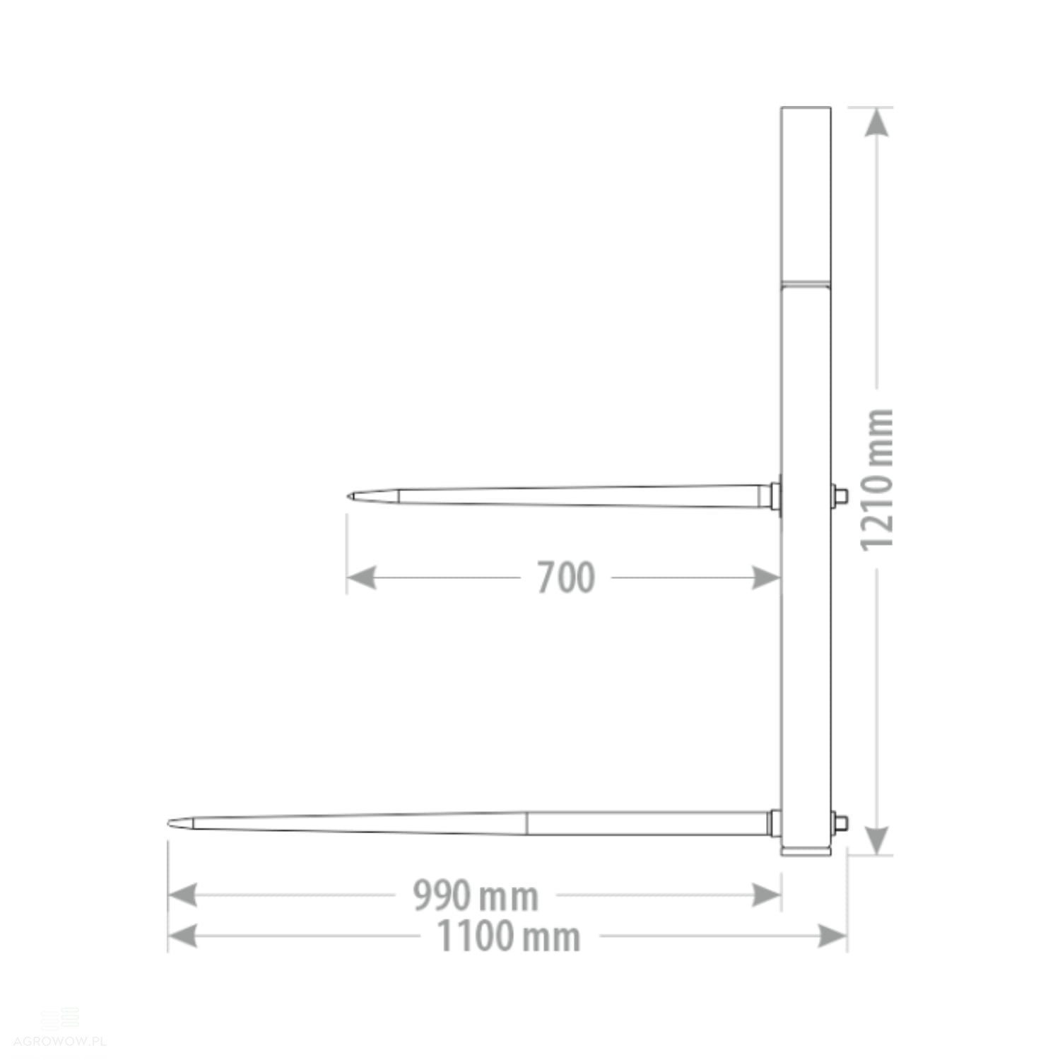 - Widły wyposażone są w cztery kute szpilki – trzy dolne o długości 990 mm oraz jedną górną o długości 700 mm – co pozwala na jeszcze pewniejsze i bezpieczniejsze uchwycenie bel, także tych o nieregularnym kształcie czy niskiej spoistości.