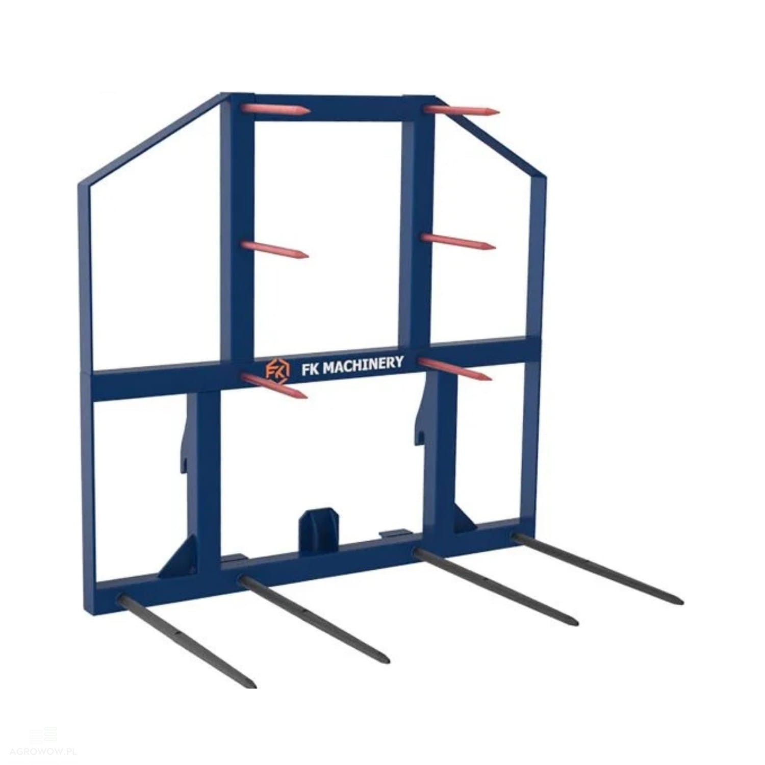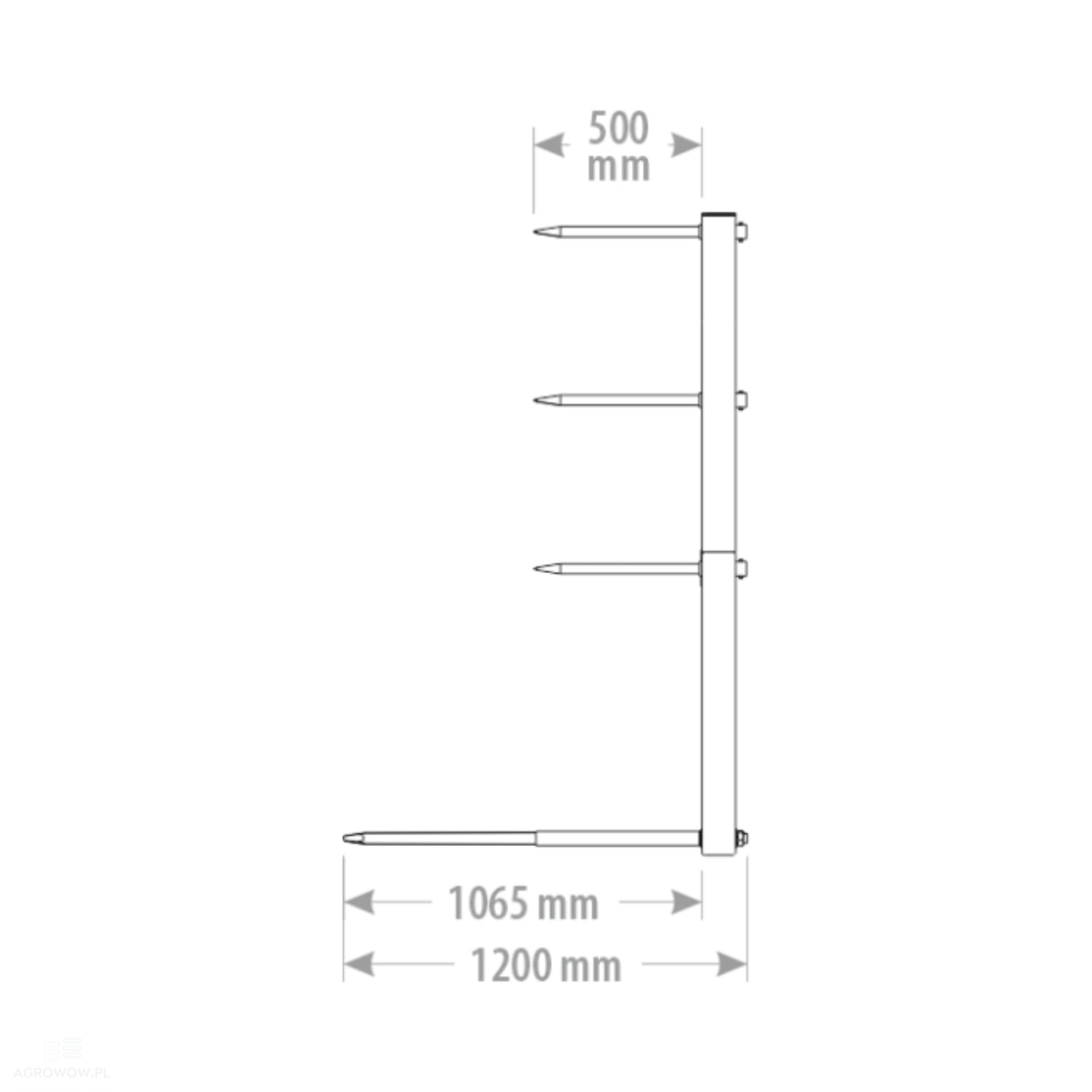 - Widły zostały wyposażone w aż 10 kutych szpilek: 4 duże o długości 1065 mm oraz 6 krótszych – 500 mm. Taki układ gwarantuje pewne podparcie ładunku, zabezpiecza bele przed przemieszczaniem się oraz ułatwia ich układanie w stosy lub na przyczepach transportowych.