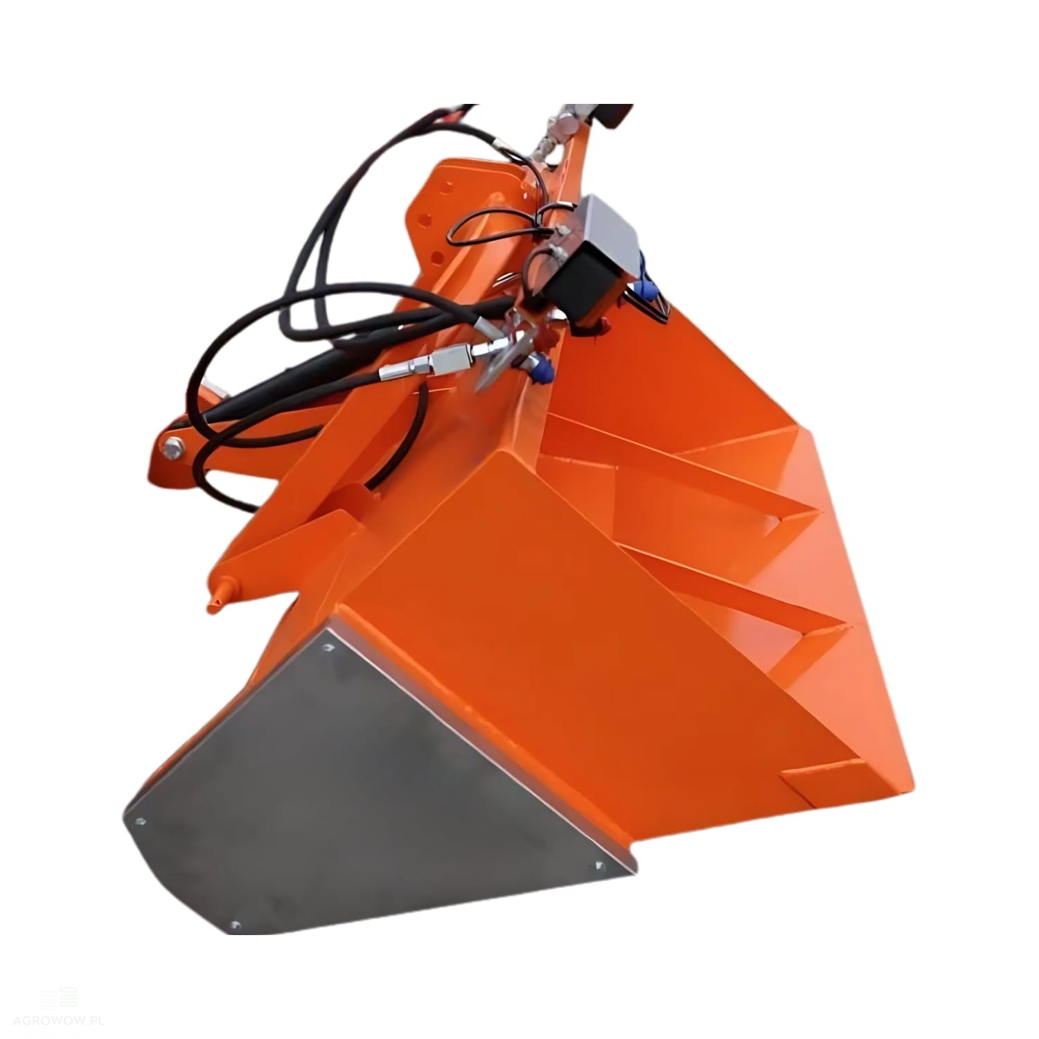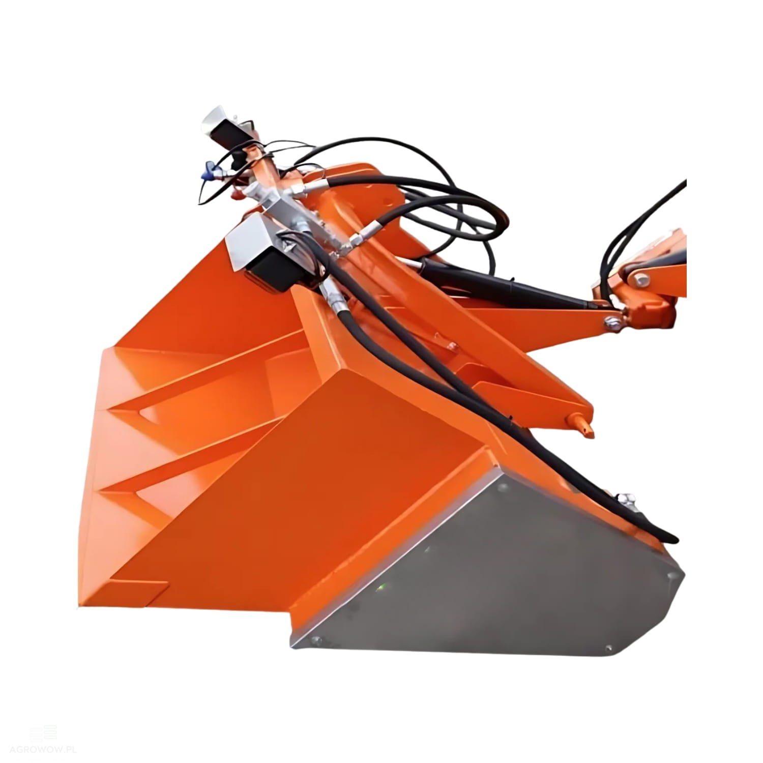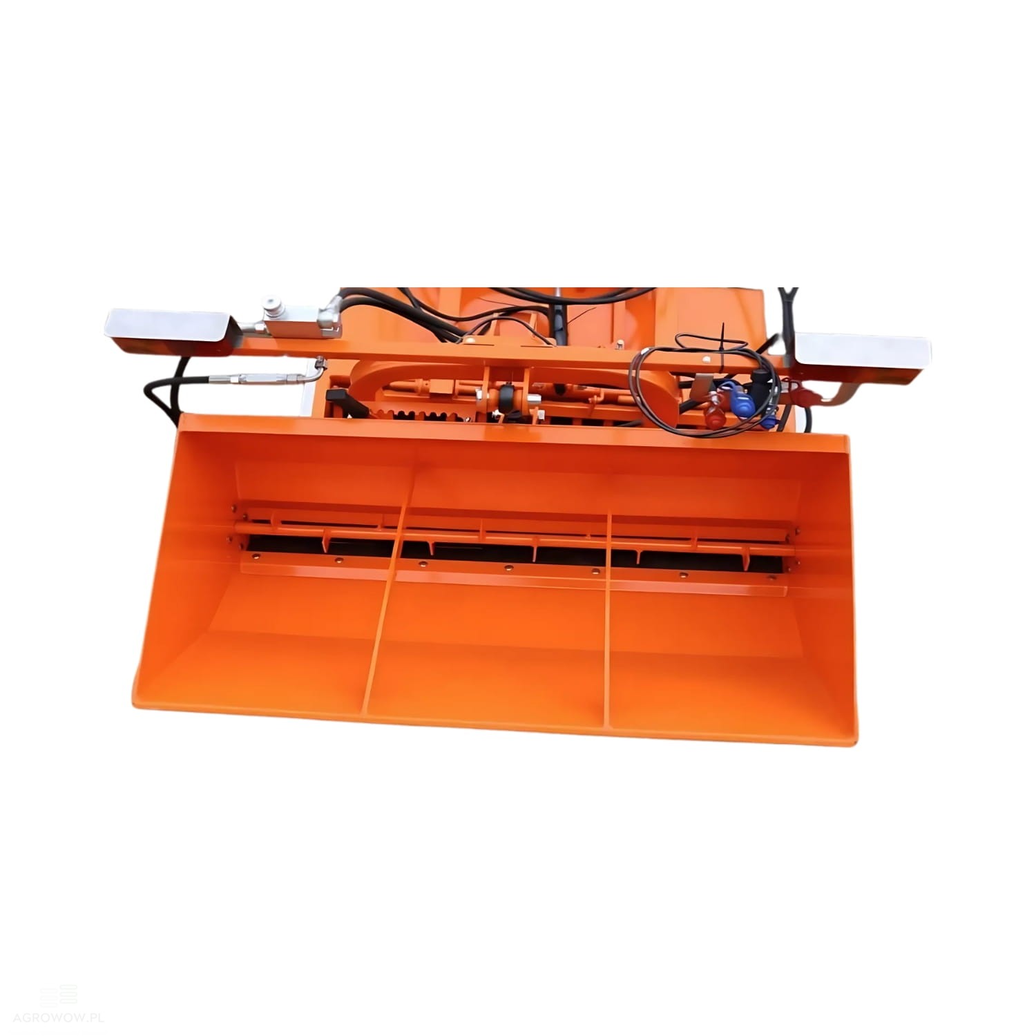 - Maszyna wyposażona jest w kosz o pojemności 1,1 m³, co pozwala na długą pracę bez konieczności częstego uzupełniania materiału.