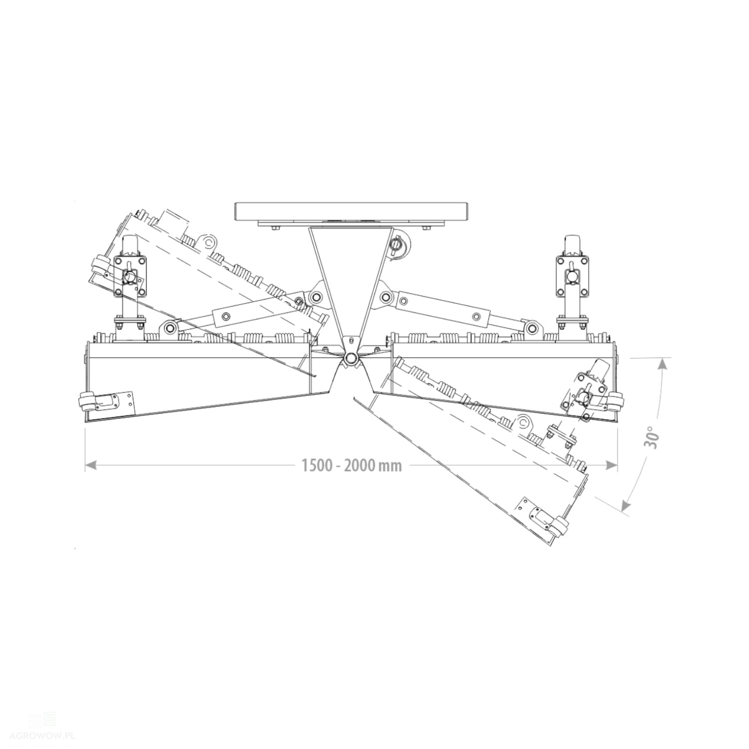 - Konstrukcja umożliwia kontrolę kąta skrętu o 30° w prawą lub lewą stronę, co pozwala na precyzyjne dostosowanie pracy pługa do różnych warunków terenowych.