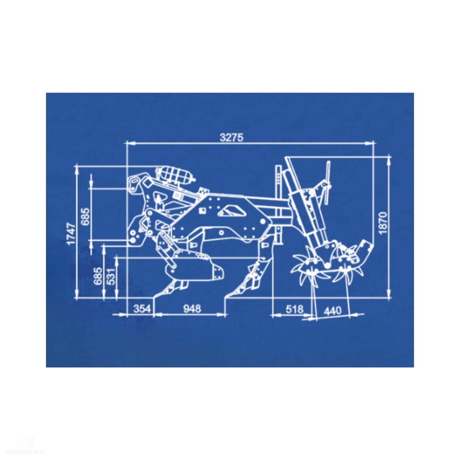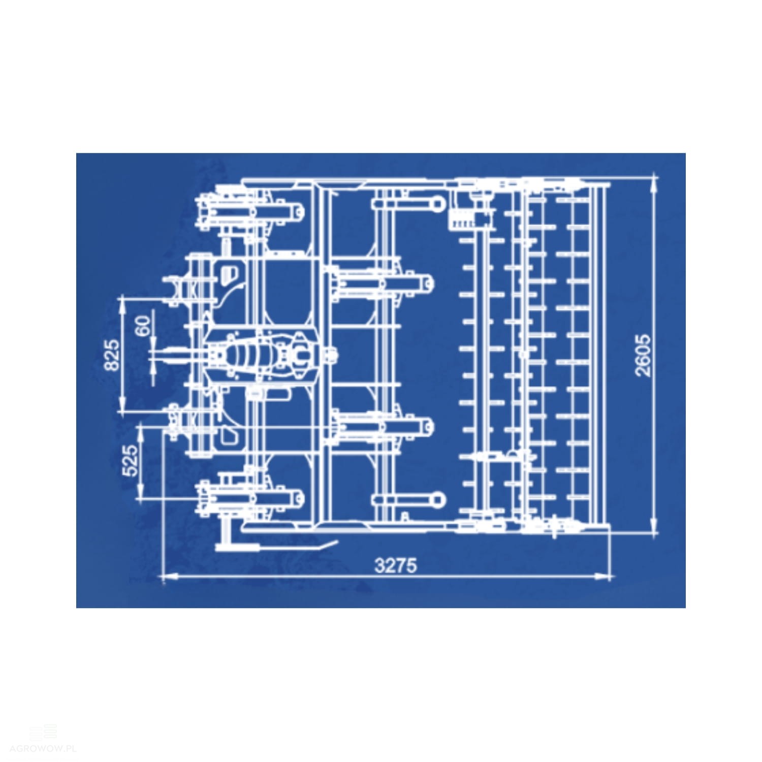 - Rama wykonana z kwadratowego profilu 100x100x8 mm gwarantuje dużą wytrzymałość, a duży prześwit pod ramą zapobiega zapychaniu się maszyny podczas pracy w trudnych warunkach polowych.