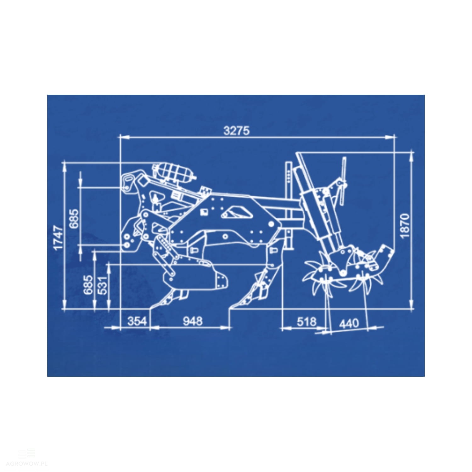 - Hydrauliczne zabezpieczenie grządzieli chroni elementy robocze w przypadku napotkania przeszkód, a duży prześwit pod ramą skutecznie zapobiega zapychaniu się maszyny.