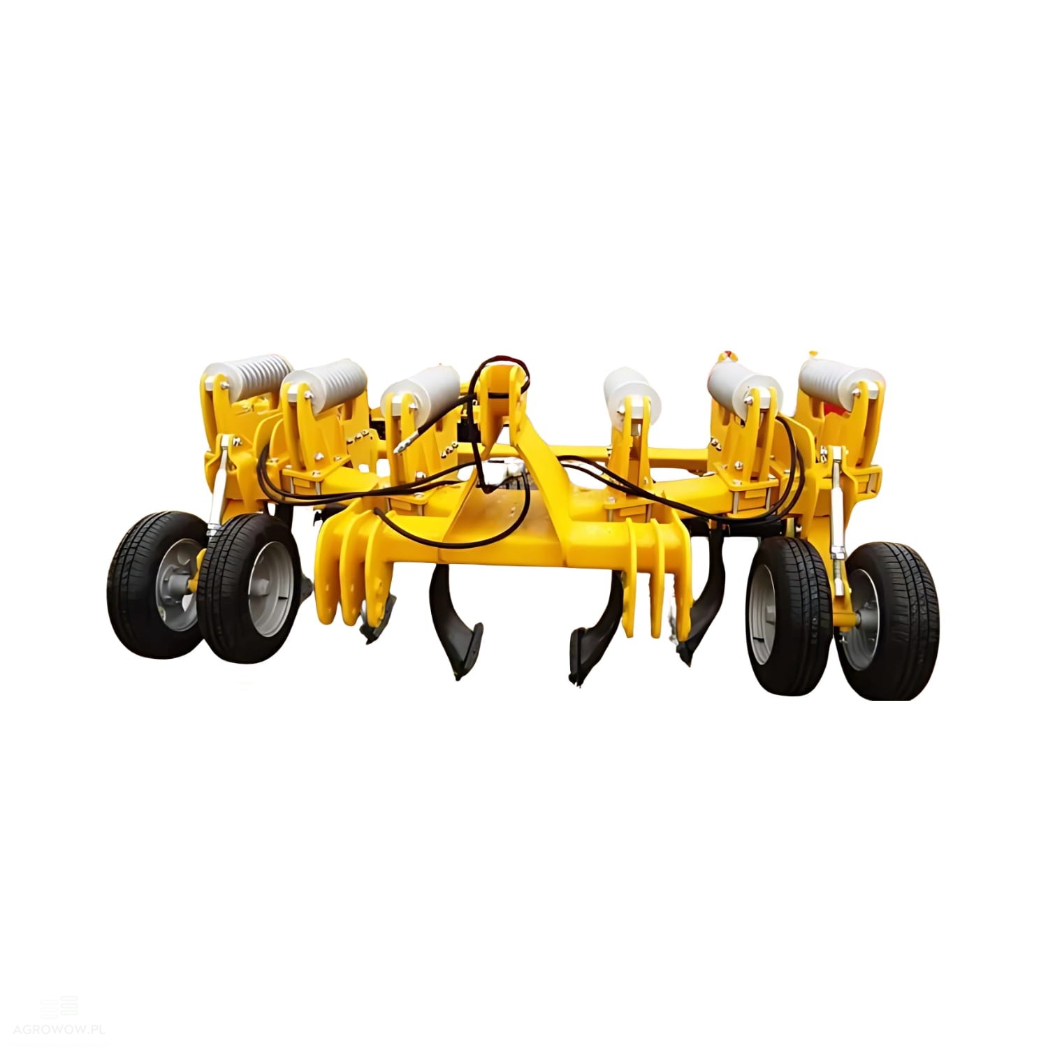 - Maszyna została wyposażona w cztery gumowe koła, które poprawiają prowadzenie urządzenia i zapewniają równomierne utrzymanie głębokości roboczej na całej szerokości roboczej.